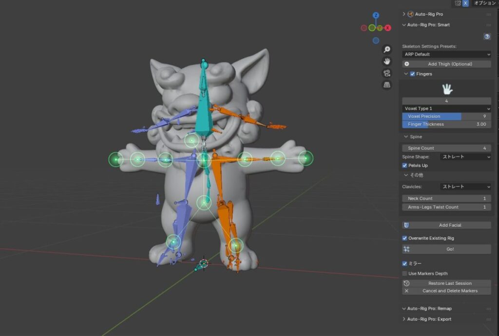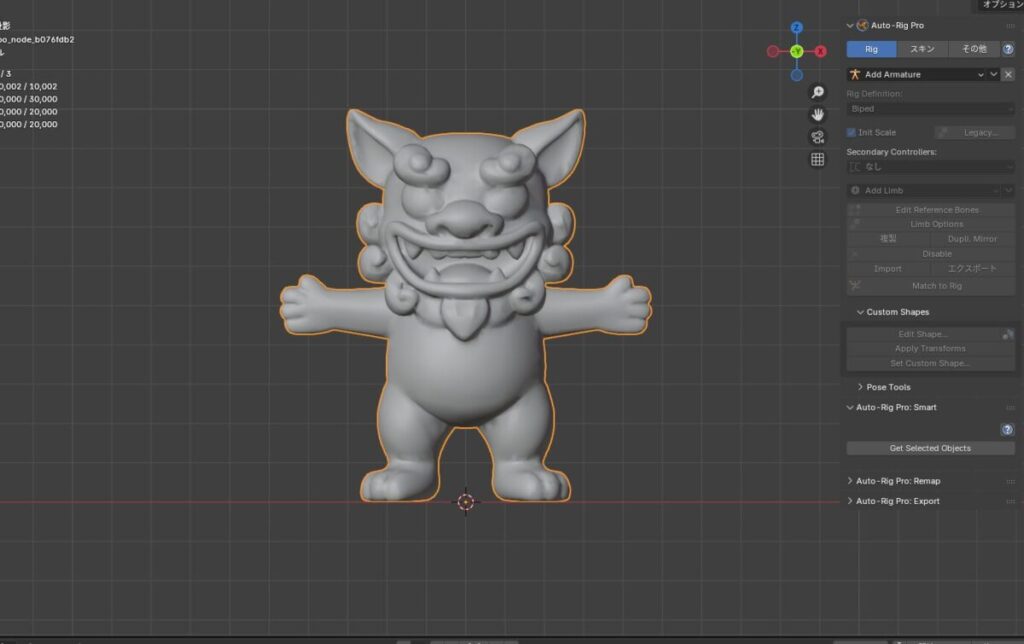 最初はAuto-Rig ProのSmart機能でリギングを試みたものの、キャラクターの体型がデフォルメ寄りなせいか、アーマチュアが不自然な配置になってしまい、思ったような結果が得られなかった。首や脚の位置がずれたり、全体的に「人型前提」の自動処理がうまく噛み合っていない感覚が強く、ツールの限界と相性の問題を実感した。