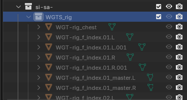 次に直面したのが、コントローラーの大きさの問題だった。デフォルメキャラに対して、デフォルトのコントローラーは小さく、操作しづらい。WEBで調べると「WGTS_rigを編集してサイズを変える」と書かれていたが、実際にはWGTS_rigがグレーアウトしており、選択すらできなかった。この時は「なぜ選べないのか分からない」という、Blender特有の詰まりポイントにハマった感覚があった。